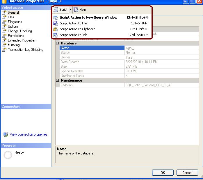 How to generate script using SSMS GUI? Leave a reply You can generate script of GUI functionality by clicking below high-lighted option in the image. It will give you all the below options. 18.520469 73.856621 Share this: Click to share on Facebook (Opens in new window) Facebook Click to share on Tumblr (Opens in new window) Tumblr Click to share on LinkedIn (Opens in new window) LinkedIn Click to share on Reddit (Opens in new window) Reddit Click to print (Opens in new window) Print Click to share on X (Opens in new window) X Click to email a link to a friend (Opens in new window) Email Click to share on Pinterest (Opens in new window) Pinterest Like Loading... Related