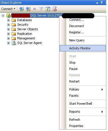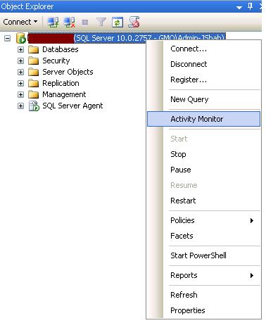 How to Open Activity Monitor from SSMS tool? Leave a reply To start Activity Monitor in SQL Server 2008 SSMS, right-click on the SQL Server name you want to monitor. From SQL Server 2008 Management Studio’s toolbar, click Activity Monitor as shown in the snippet below. 18.520469 73.856621 Share this: Click to share on Facebook (Opens in new window) Facebook Click to share on Tumblr (Opens in new window) Tumblr Click to share on LinkedIn (Opens in new window) LinkedIn Click to share on Reddit (Opens in new window) Reddit Click to print (Opens in new window) Print Click to share on X (Opens in new window) X Click to email a link to a friend (Opens in new window) Email Click to share on Pinterest (Opens in new window) Pinterest Like Loading... Related