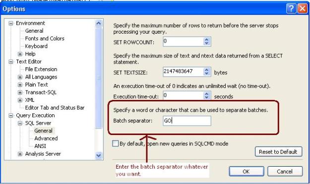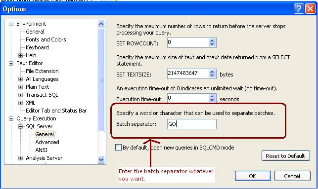 SSMS T-SQL Batch Separator Leave a reply It is often asked by the people can we change the batch separator T-SQL. Answer is yes we can change the batch separator. We can do it by Tools->Options->Query Execution->SQL Server->General->Batch separator 18.520469 73.856621 Share this: Click to share on Facebook (Opens in new window) Facebook Click to share on Tumblr (Opens in new window) Tumblr Click to share on LinkedIn (Opens in new window) LinkedIn Click to share on Reddit (Opens in new window) Reddit Click to print (Opens in new window) Print Click to share on X (Opens in new window) X Click to email a link to a friend (Opens in new window) Email Click to share on Pinterest (Opens in new window) Pinterest Like Loading... Related