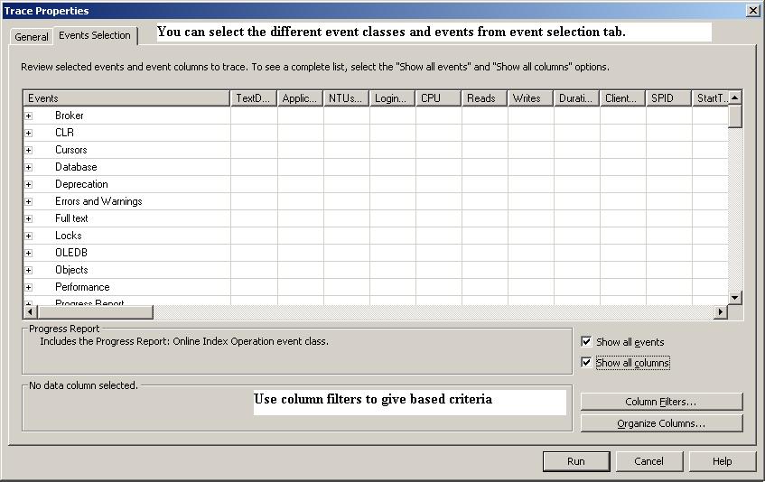 Filter Data can be filtered by specifying criteria of selection during the execution of an event. This feature is used to reduce the size of the Trace.