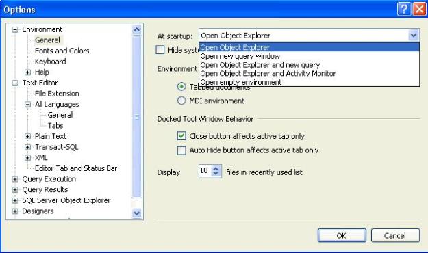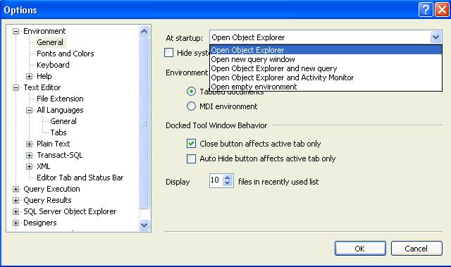 SSMS Startup Options Leave a reply You can configure SSMS to startup with the below options. Default one is Open Object Explorer. Go Tools –> Options –>Environment(page)–>General. Options are self explanatory. 18.520469 73.856621 Share this: Click to share on Facebook (Opens in new window) Facebook Click to share on Tumblr (Opens in new window) Tumblr Click to share on LinkedIn (Opens in new window) LinkedIn Click to share on Reddit (Opens in new window) Reddit Click to print (Opens in new window) Print Click to share on X (Opens in new window) X Click to email a link to a friend (Opens in new window) Email Click to share on Pinterest (Opens in new window) Pinterest Like Loading... Related