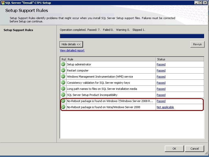 - Your Operating system must have “no-reboot” package installed prior to installing SQL Server 2011. By default it is included in Windows 7 SP1 and Windows Server 2008 R2. For the other OS you can download No Reboot package from http://support.microsoft.com/kb/982526 link.