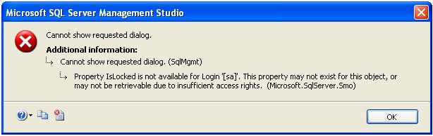 Problem: Property IsLocked is not available for Login ‘[sa]’. This property may not exist for this object, or may not be retrievable due to insufficient access rights. (Microsoft.SqlServer.Smo)