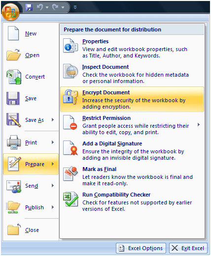 Step 1: File -> Prepare -> Encrypt Document