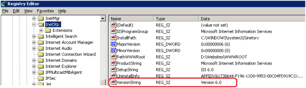 You can check IIS version by simply typing http://localhost into Internet Explorer, or you can browse the registry path HKEY_LOCAL_MACHINE\SOFTWARE\Microsoft\InetStp\ and check for the VersionString registry value.