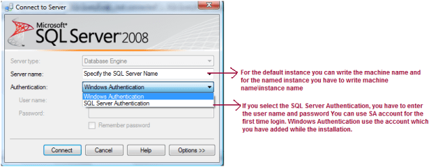 Once the SQL Server is installed click on the SQL Server Management Studio, It will show you the below screen. I have explain all the items in image to connect SQL Server.