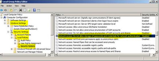 Step 2: Go to Security Settings –> Local Policies –> Security Options and disable the Network Access: Do not allow storage of passwords and credentials for network authentication option.
