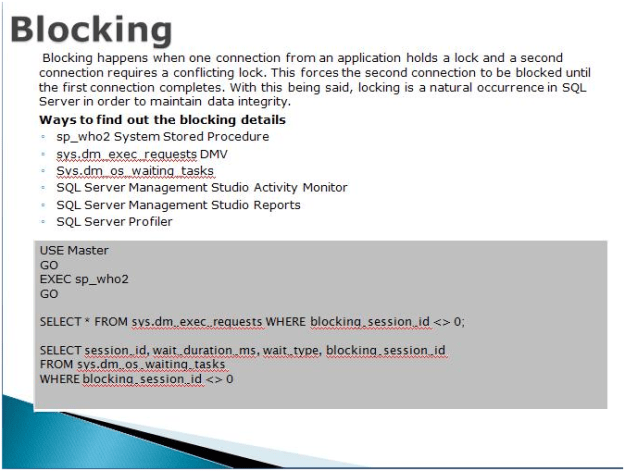 Deadlocking occurs when two user processes have locks on separate objects and each process is trying to acquire a lock on the object that the other process has. When this happens, SQL Server identifies the problem and ends the deadlock by automatically choosing one process and aborting the other process, allowing the other process to continue. The aborted transaction is rolled back and an error message is sent to the user of the aborted process. Generally, the transaction that requires the least amount of overhead to rollback is the transaction that is aborted.