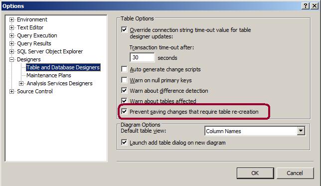 Go to SSMS – Select Tools menu -> click on Options -> Go to Designers tab page -> Click on “table and database designers” page -> Un-check “Prevent Saving changes that require table re-creation” check box.